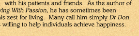 Also known as "Dr Don", he is a nationally recognized expert and has entertained, amused, excited and inspired audiences across the country on both television and radio. He has been written about everywhere from The California Therapist to Redbook Magazine.